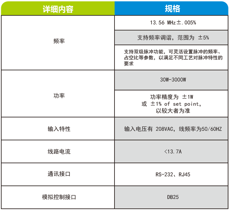 01 尺寸外形 02 工作框圖 該設(shè)備中的功放模塊產(chǎn)生高頻電壓、電流,將常規(guī)使用的208V電壓和頻率50/60HZ轉(zhuǎn)換為可變的13.56MHZ電壓電流。 03 設(shè)備應(yīng)用 (一)半導(dǎo)體制造 在半導(dǎo)體芯片的刻蝕、沉積、離子注入等關(guān)鍵工藝環(huán)節(jié),SRF3000憑借其精準的頻率和功率控制、高效的集成匹配以及穩(wěn)定的性能,為芯片制造提供穩(wěn)定可靠的等離子體電源解決方案,助力提升芯片制造的精度和良品率。 (二)平板顯示生產(chǎn) 在平板顯示面板的制造過程中,如 TFT - LCD、OLED 等工藝,SRF3000可滿足不同工藝階段對射頻電源的需求,確保薄膜沉積均勻、刻蝕精準,提升面板的顯示質(zhì)量和生產(chǎn)效率。 (三)光伏產(chǎn)業(yè) 在光伏電池的生產(chǎn)中,無論是硅片的刻蝕、薄膜的沉積還是電池的鈍化等工藝,SRF3000都能以其卓越的性能為光伏電池的生產(chǎn)提供穩(wěn)定的能量供應(yīng),助力提高光伏電池的轉(zhuǎn)換效率和生產(chǎn)質(zhì)量。 04 產(chǎn)品優(yōu)勢 (一)精準頻率控制 穩(wěn)定基準頻率:具備 13.56 MHz±.005% 的精準頻率輸出,為等離子體工藝提供穩(wěn)定可靠的基礎(chǔ)條件,確保每一次工藝過程的一致性。 靈活頻率調(diào)諧:支持頻率調(diào)諧范圍為±5%,可根據(jù)不同工藝需求進行靈活調(diào)整,無論是精細的刻蝕工藝還是均勻的沉積過程,都能精準適配。 (二)卓越功率性能 寬功率調(diào)節(jié)范圍:功率覆蓋30W - 3000W,滿足從實驗室研發(fā)到大規(guī)模工業(yè)生產(chǎn)的多樣化功率需求。 高精度功率調(diào)節(jié):功率可調(diào)精度達到 0.1 瓦,實現(xiàn)對功率的精細控制,保證工藝過程的穩(wěn)定性和可重復(fù)性。 雙級脈沖功能:支持雙級脈沖功能,可靈活設(shè)置脈沖的頻率、占空比等參數(shù),滿足不同工藝對脈沖特性的嚴格要求,為復(fù)雜工藝提供更多可能性。 (三)高效集成匹配 一體化架構(gòu):采用一體化集成匹配架構(gòu),實現(xiàn)亞毫秒級快速動態(tài)響應(yīng)能力。在負載阻抗發(fā)生變化時,能迅速做出調(diào)整,確保射頻能量高效傳輸,減少能量損耗。 全數(shù)字控制:運用全數(shù)字控制技術(shù),通過高精度 ADC 實時采集反射功率、正向功率等關(guān)鍵數(shù)據(jù),由數(shù)字信號處理器(DSP)進行快速運算與控制,提升匹配精度和系統(tǒng)穩(wěn)定性。 (四)便捷控制方式 豐富通信接口:配備RS - 232、用戶端口、以太網(wǎng)等接口,方便與其他設(shè)備進行通信和集成控制。無論是本地操作還是遠程監(jiān)控,都能輕松實現(xiàn),滿足現(xiàn)代化生產(chǎn)的智能化管理需求。 遠程操作功能:可實現(xiàn)遠程監(jiān)控、參數(shù)設(shè)置和數(shù)據(jù)傳輸?shù)裙δ?,讓您坐在辦公室就能對生產(chǎn)線上的設(shè)備進行實時管理和調(diào)整,提高生產(chǎn)效率。 (五)全方位保護機制 多重保護功能:擁有完善的過流保護、過壓保護、過熱保護等機制,在設(shè)備運行出現(xiàn)異常情況時,能迅速啟動保護措施,有效保護設(shè)備不受損壞,確保系統(tǒng)長期穩(wěn)定運行。 (六)同步運行保障 相位同步功能:具有相位同步功能,可實現(xiàn)多個系統(tǒng)在集群配置中的同步運行,確保工藝的一致性和穩(wěn)定性,尤其適用于大規(guī)模生產(chǎn)場景下對工藝精度的嚴格要求。 (七)先進弧管理 高效電弧處理:先進的弧管理功能,能夠快速檢測和處理等離子體中的電弧現(xiàn)象,減少電弧對工藝的影響,提高工藝的重復(fù)性和產(chǎn)品質(zhì)量,降低次品率。 (八)友好操作界面 兼容操作體驗:完全兼容AE VFP,支持中英文界面,無論是國內(nèi)還是國外的操作人員,都能輕松上手,減少操作培訓(xùn)成本,提高工作效率。 05 技術(shù)參數(shù)